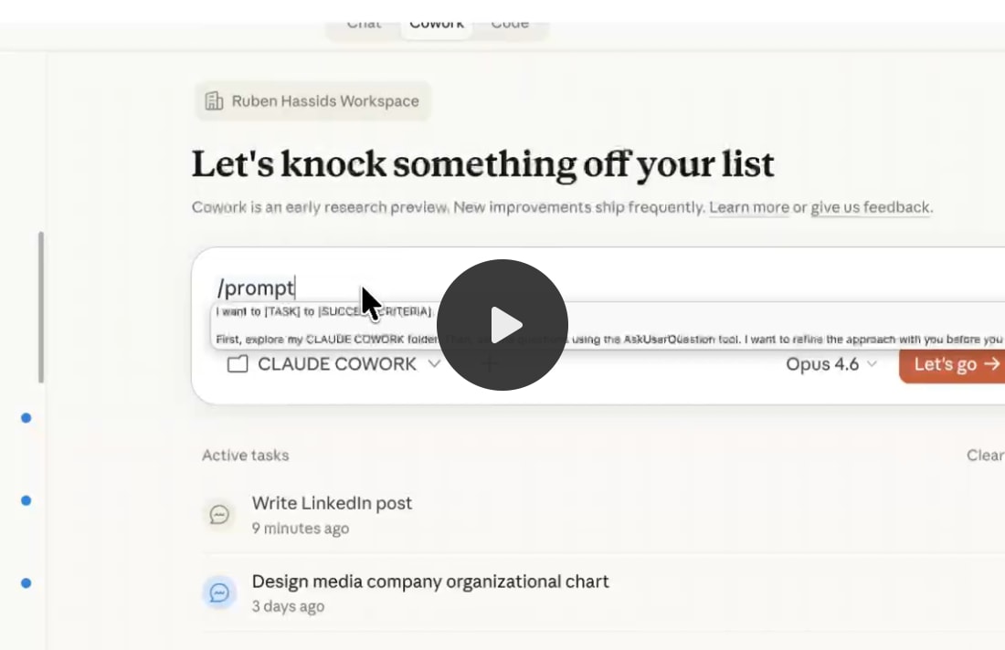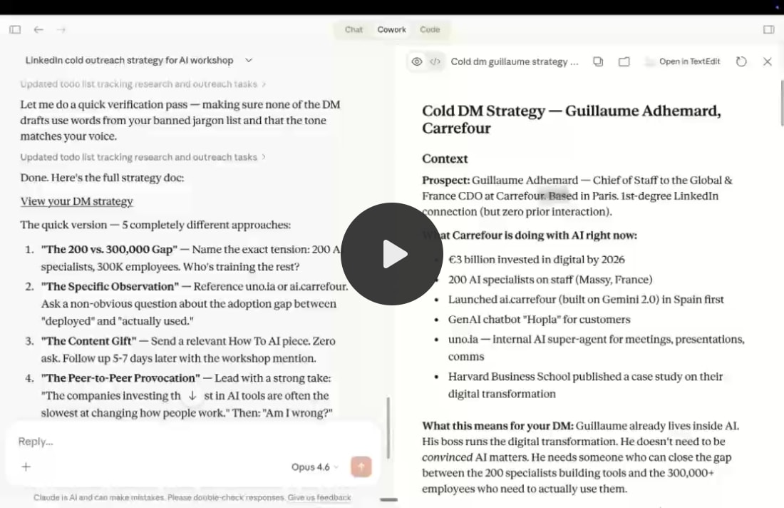 What happens: Claude reads the brief. Compares it to my template format. Then it asks me things I didn't think of — "Should this include a timeline or just recommendations?" and "Do you want competitor examples or keep it internal?" I click answers. It creates a .docx file directly in my folder. Use case 3: Research and competitive analysis.The setup: I drop 3-5 competitor articles or reports into a subfolder. The prompt: What happens: That used to be a junior job in my company. Now it’s a prompt. Use case 4: Automated weekly briefing.This one is different. Cowork works without you even being there. The setup: You create a folder called /weekly-briefings/. The prompt (with /schedule, it’s a plugin): What happens: Cowork runs automatically every Monday, as long as your computer is awake and the app is open. You wake up to a briefing doc ready to read. That’s the endgame. Across all four use cases, the pattern is the same. I never write a long prompt. I write a short task, point to my folder, and say “ask me questions.” The workflow is always the same. Only the context changes. 10. Where Cowork falls short (I promised honesty).It eats your usage fast. A single Cowork session can burn through what would normally be dozens of regular chat conversations. On the Pro plan ($20/month), you’ll feel it within a week if you use it daily. If Cowork becomes your main workflow, consider Max ($100/month). I’m being direct about this because I don’t want you surprised. It’s still a research preview. Anthropic says this explicitly. It can make mistakes. It can misread files. It sometimes takes an odd approach to a task when a simpler one would work. You need to review what it produces. Don’t send a client deliverable without reading it first. It needs the app open. Close the Claude Desktop app, and the session dies. There’s no mobile version. No web version. Cowork only runs inside the desktop app on macOS or Windows. It’s not for quick questions. If you want to ask “what’s the capital of France,” use Chat. Cowork is for tasks, not trivia. It’s designed for multi-step work. Agents can be hit or miss. For complex tasks, Cowork breaks the work into parts and runs them in parallel using multiple agents. Most of the time, it’s fast and accurate. Sometimes one agent goes in a weird direction, and the final output has a section that doesn’t match the rest. Keep an eye on it. Happens 10% of the time. Cowork is not the best at everything. But it’s getting better every week. And if this is Claude Opus 4.6 + Cowork, I can’t imagine Claude 5, Claude 6… 11. Your first 30 minutes with Cowork.Open your calendar. Book 30 minutes with yourself, this newsletter, and Claude. Minutes 0–5: Install and open Cowork.→ Go to claude.com/download. Download the desktop app. → Sign in with your Pro account ($20/month. Or $17/month if you pay annually). → Open the app. Click the Cowork tab at the top. → You’re in. Minutes 5–10: Build your context folder.→ Create a folder on your computer called “Claude-Cowork.” Inside it, create four subfolders: ABOUT ME, TEMPLATES, PROJECTS, CLAUDE OUTPUTS. → In the context folder, create your first file: about-me.md. Write three things: (1) What you do for work. (2) How you like to communicate. (3) One example of writing you’re proud of. Paste it in. → No time to write it yourself? Skip to minute 10 and let Cowork create it for you. Pro tip: Instead of typing, use Wispr Flow to talk. It’s 4x faster. Minutes 10–15: Start your first Cowork conversation.→ In Cowork, click Add Folder and select your Claude-Cowork folder. → Make sure to select Opus 4.6 + Extended thinking for the smartest AI. → Type: “I want [task] for [success criteria]. Go through my folder first, and use AskUserQuestion tool so you gather enough content before executing.” → Watch what happens. A form appears. Click answers. Let it create your context files. Minutes 15–20: Install a plugin.→ Click Customize in the sidebar → Browse plugins. → Pick one that fits your work. Good starters: Productivity (tasks and workflows), Marketing (content drafting), or Sales (prospect research). → Click to install. Start a new conversation with the plugin active. → Type / to see what slash commands are available. Try one. Minutes 20-30: Create a tough deliverable.→ Give Cowork a task you’d actually need for work this week. → Type: “Create a [report / deck / document] based on the files in this folder. Ask me questions first.” → Watch it create a real file. Open it. Edit it. Use it. → Optional: be amazed. 12. I don’t care about Claude.I don’t care about Claude, ChatGPT, Grok, Gemini, or any other model. I don’t pick sides. I’m not paid to make this newsletter. I’m sharing, twice a week, how my work is transforming (very fast) with AI. As I’m trying to keep up, I want you to keep up. So we move just as fast. I want to be the greatest filter to the AI noise. And 338,000+ people read this twice a week to focus on the How. Some came because of my LinkedIn. But most readers subscribed because someone they trusted sent one of my articles to them. If this article helped you, be that person for someone else (and share it): It does not cost you anything to share. And sharing is caring :) If someone did send you this, thank them and subscribe for free here: archive of my past blogs: https://docs.google.com/document/d/1pWuMCBVQo1zKcgKltX_BZxAr31KgxmOlp3Vzvmc5Hxc/edit?usp=sharingYou're currently a free subscriber to How to AI. For the full experience, upgrade your subscription. |
