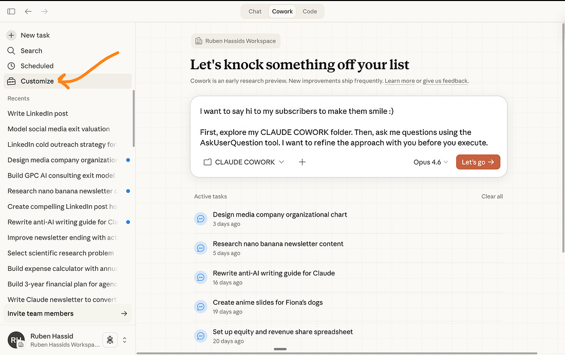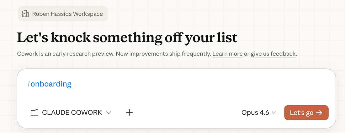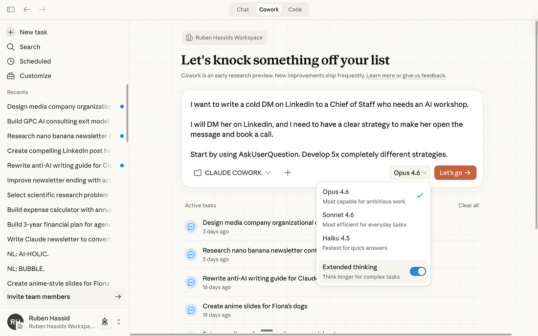 This newsletter is the full playbook of Cowork. How to set it up. How I use it every single week to write this newsletter, deliver consulting work, and research faster than I ever could alone. Also, where it falls short (I keep promising honesty). Two things before we start: 1. Save this guide and spend 30 minutes this weekend to explore Cowork. 2. Send it to anyone who still hasn’t tried Cowork (or Claude). 1. You must forget about prompts.You read my Claude guide. So you installed it correctly. Just a quick reminder for those who didn’t read it: