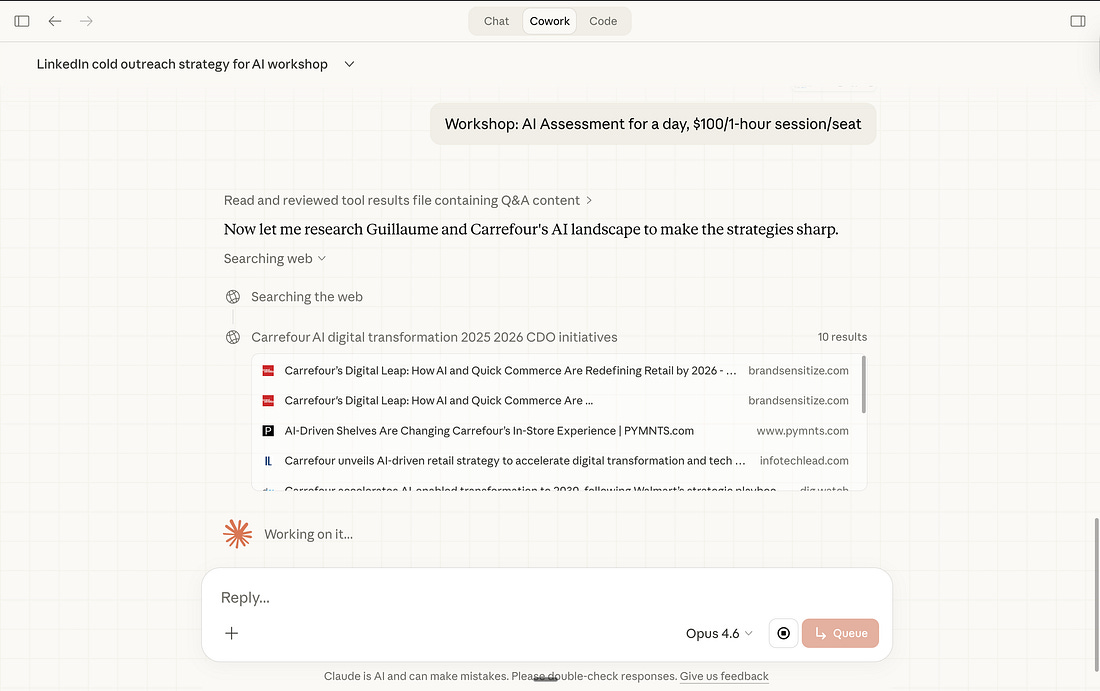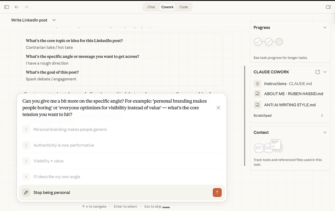 What happens: Claude reads every file. Generates a form asking about my audience, my tone, what length, what angles the other guides missed. I click answers. It produces an outline. I push back on weak sections. It adjusts. Then it writes — and because it has my voice profile and anti-AI writing guide, the output actually sounds like me.* I edit. But the heavy lifting is done. This newsletter you’re reading right now was outlined by Cowork and written by me. But you don’t care and you keep reading :) *look, he used an em-dash, it must be AI!!! no i did it on purpose. Use case 2: Consulting deliverables.The setup: Client sends a brief. I drop it in the folder next to my templates and past deliverables. The prompt: