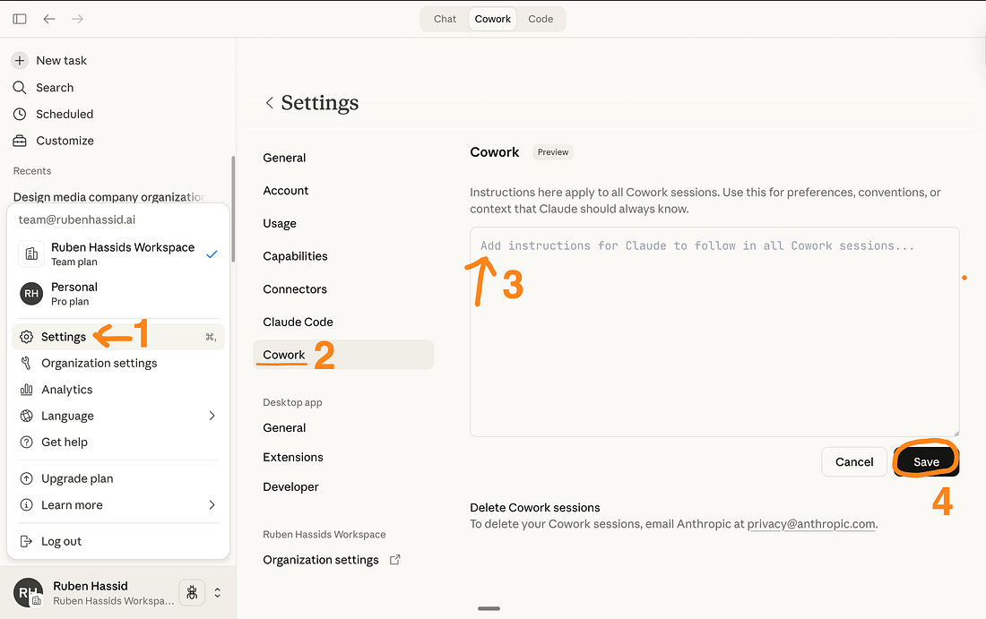Quick note: a markdown file is just a plain text file with an .md extension. Open any text editor (even a Google Doc works), write your content, and save it as about-me.md instead of about-me.txt. Claude reads them better. One great markdown file is worth more than 50 random uploads. Don’t dump everything into the folder. Be intentional about what you include. Step 3: Set Global Instructions.Go to: Settings → Cowork → Edit Global Instructions. Global Instructions handle how Claude must (always) behave. Paste this:
