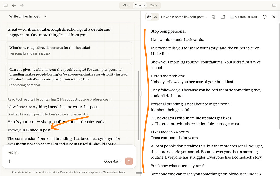 What happens: Claude reads your context files, generates a clickable form asking about your audience, your goals, your preferences. You click through in under a minute. Claude shows a plan. You approve. It executes — creating real files in your folder. If something’s off midway, you interrupt. Claude recalibrates with a new form. Picks up where it left off. The entire process feels like directing someone smart instead of wrestling with a text box. I’m obsessed with this feature. (Yes, I stopped writing prompts. My prompt folder is collecting dust.) I even added a “Text Replacement” on my Mac so that whenever I am typing the command “/prompt” it pastes this one prompt: