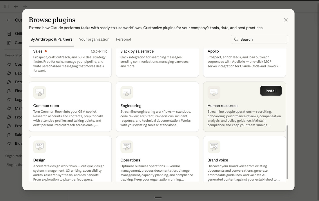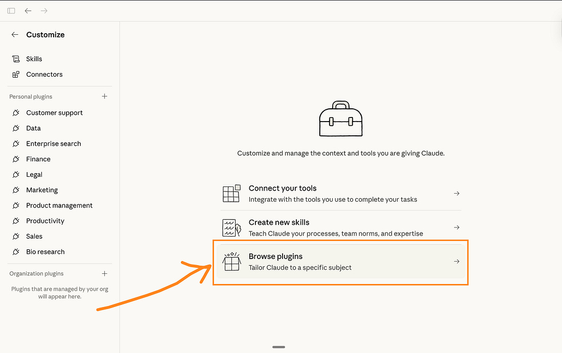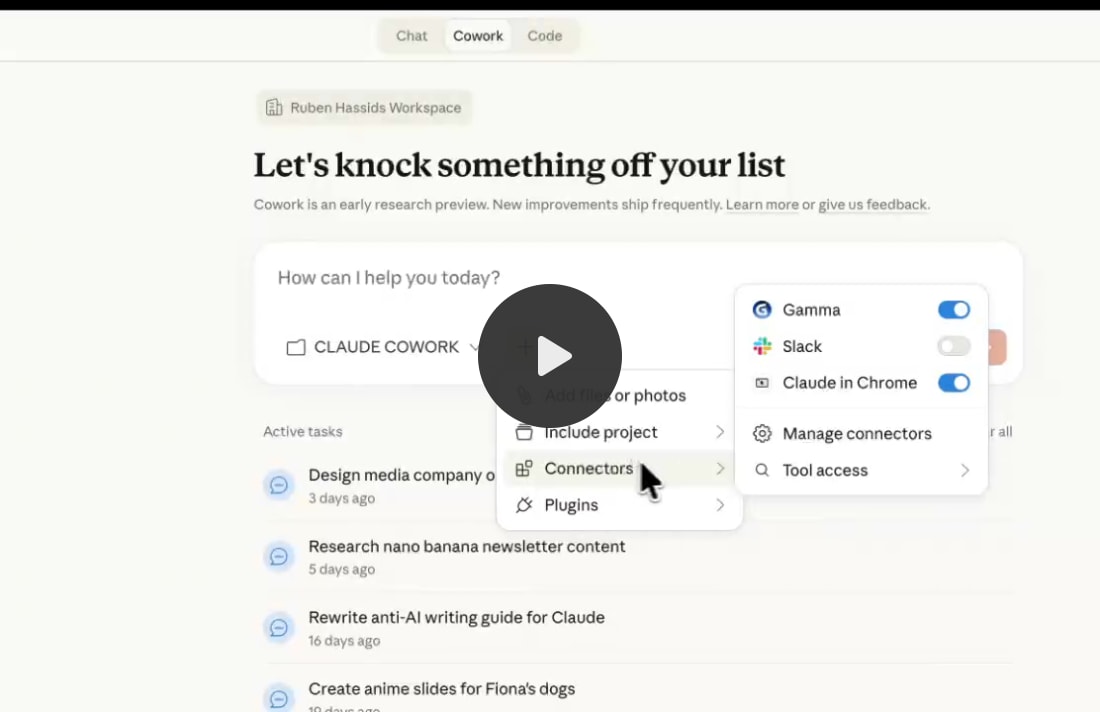 7. How to use Plugins inside Cowork.Remember that $830 billion stock crash I opened with? Anthropic released 11 official plugins. Sales. Marketing. Legal. Finance. Data analysis. Product management. Customer support. Each one gives Claude specific skills, workflows, and slash commands for that function. Legal software lost so much value because Claude can do the work. And the plugins sitting in your Cowork sidebar are a big part of what triggered that reaction. You don’t need to be technical to install it. I promise. How to install:1. Open Cowork. 2. Click Customize in the left sidebar → Browse plugins. 3. Pick one that matches your work. Install. 4. Type / in the chat to see available slash commands. What this looks like in practice:Marketing plugin The prompt: /marketing:draft-content → “Write a LinkedIn post about [topic]. Use my voice profile. Target [audience].” What happens: Claude reads your about-me.md, drafts a post that actually sounds like you, and suggests hook variations. You pick one, edit, post. Five minutes instead of thirty. Data plugin The prompt: /data:explore → Drop a CSV into the folder. What happens: Claude summarizes every column, flags anomalies, suggests analyses, and can build an interactive dashboard. It writes SQL in plain English. You don’t touch a formula. Legal plugin The prompt: “Review the NDA in this folder. Flag anything unusual or one-sided.” What happens: Claude reads the contract, highlights risky clauses, explains each one in plain English, and suggests alternative language. This is what wiped $285 billion off the stock market. 8. Connectors: Claude, inside your tools.Cowork can also connect to your existing tools. Slack, Google Drive, Notion, Figma, and 50+ others. They’re called Connectors. Go to Settings → Connectors. Browse the directory. Click “Add.” Done. Once connected, it reads your tools. Claude can search your Slack messages, pull from your Google Docs, or reference your Notion pages mid-conversation. Here’s an example with Gamma. Oh, and I forgot - connectors are free. 9. How I actually use Cowork every day.I don’t use anything else these days. Use case 1: Writing this newsletter.The setup: My folder has my about-me.md, my anti-AI-writing-guide.md, past newsletters that performed well, reference guides from other creators, and official documentation from companies (like OpenAI/Anthropic/Google). The prompt: