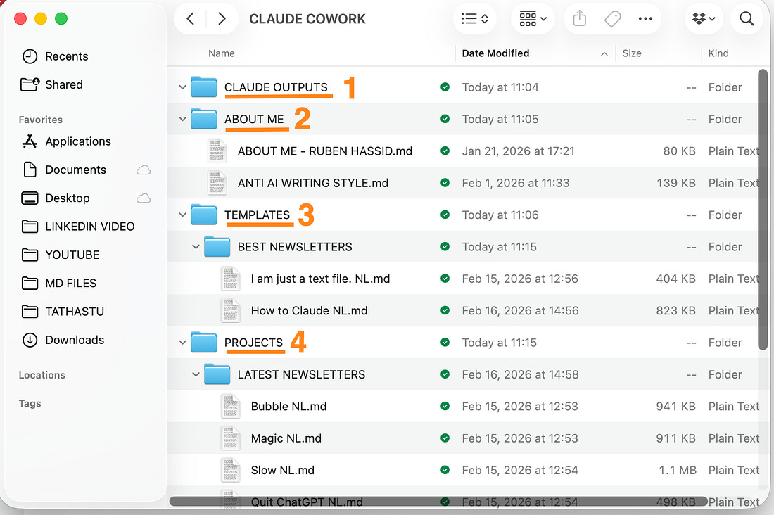 This keeps things organized and limits what Claude can see. Cowork has real read/write access to whatever folder you share. If something goes wrong, you want the damage contained. You must keep it tight. Now here’s how to create your own core files: Step 2: Create your core files.You now have 4 folders within your mega “Claude Cowork” folder. Let’s create the “About me” files now: File 1: about-me.md — Who you are. What you do. Your current priorities. What matters to you right now. I wrote an entire newsletter on how to do it. File 2: anti-ai-writing-style.md — Because I hate the AI style. So I made a text file on how to NEVER write like an AI. I share how to download it below. Download my 3x md files by subscribing to my newsletter for free. Do not pay for anything. Open my welcome email & you will access my Notion doc with md files.