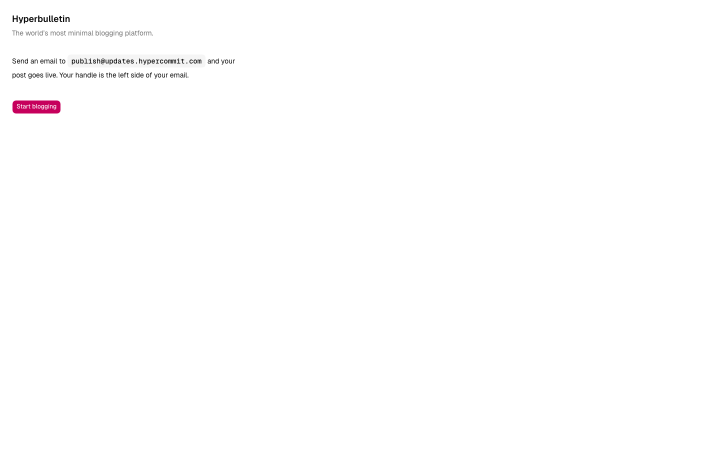Pivot day. The whole site is one screen. Tagline: "The world's most minimal blogging platform." You publish by emailing publish@updates.hypercommit.com. Your handle is the left side of your email. No login, no account, no feed surfaced on the homepage. The old numbered posts (#1 to #18) are gone; /posts/N now returns 404.